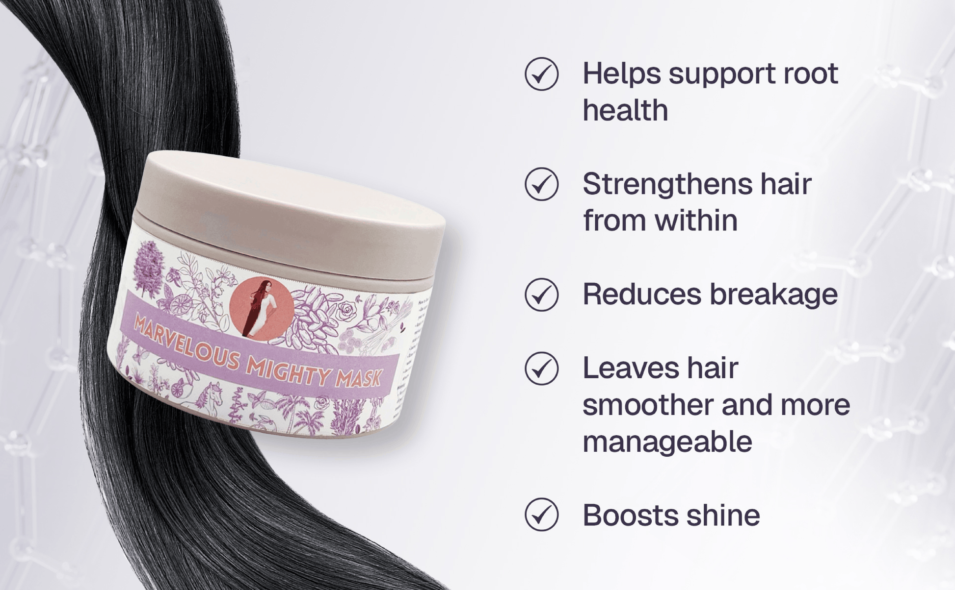 Meet your new hair revival essential. The Marvelous Mighty Mask is an intensive treatment designed to fortify hair from root to tip, helping restore strength, smoothness, and shine with every use. Packed with deeply nourishing ingredients and root-supporting nutrients, this mask works to repair damage, reduce breakage, and enhance the structure of each strand.